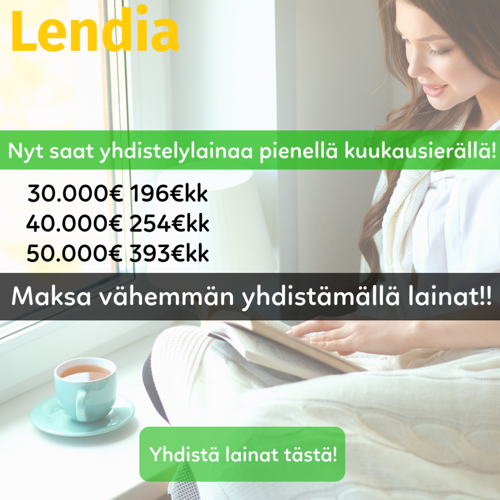 Lendia on kotimainen lainojen kilpailuttamispalvelu jonka kautta tuhannet tyytyväiset asiakkaat ovat saaneet 20.000€ – 70.000€ kokoisia lainoja ja yhdistelylainoja!